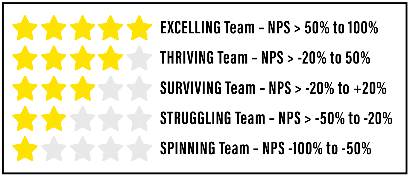To simplify the discussion about how to interpret a 3V NPS % number we use another metaphor, “5 star rating” to reflect the team's level of performance.
